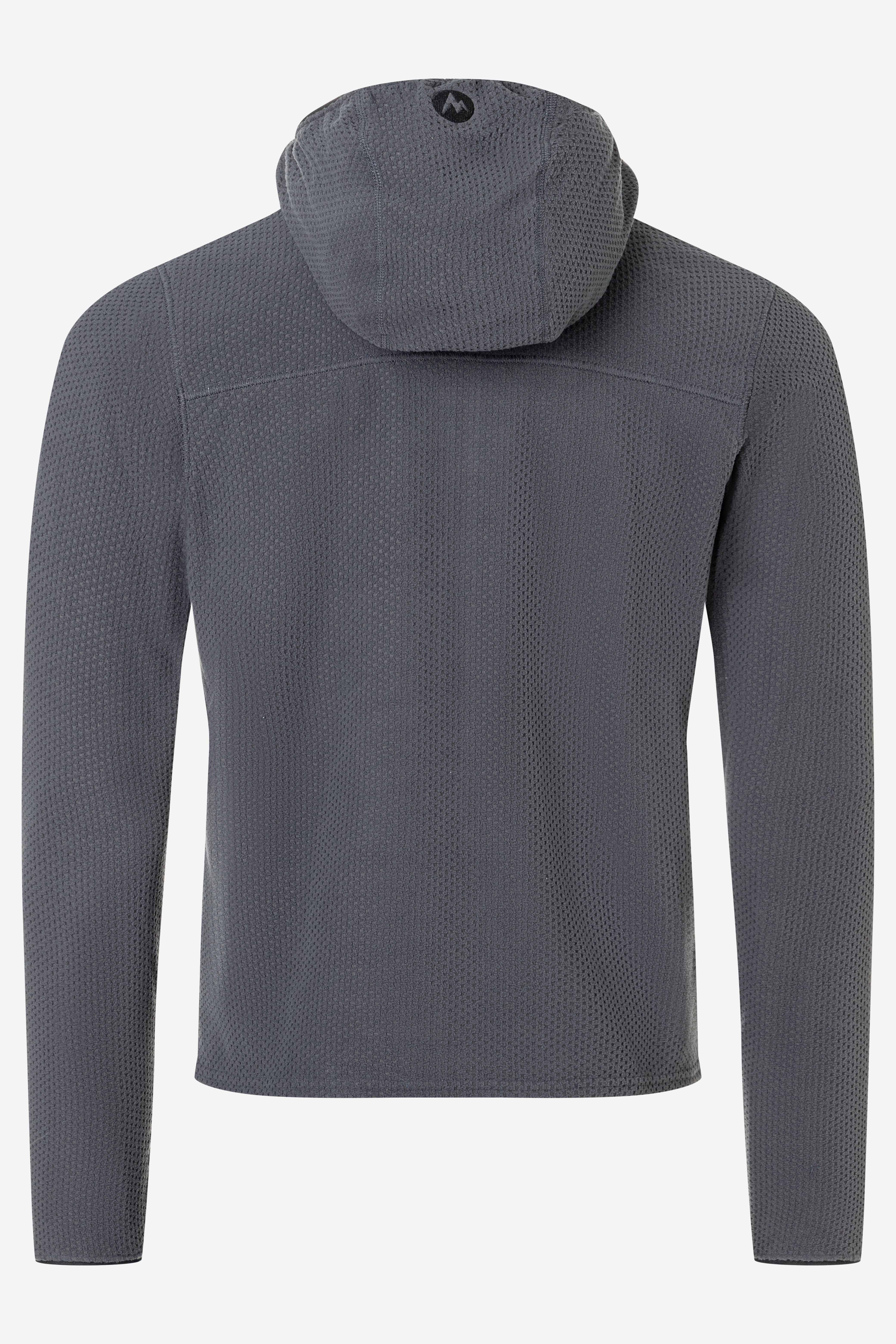 The Marmot AirFleece Hoody is a men’s lightweight fleece hoodie designed for hiking, layering, and active outdoor use. It is made from 100% recycled polyester jacquard fleece with a distinctive grid structure that improves breathability, traps warmth, and reduces bulk, while the slim fit makes it an excellent midlayer under a shell or jacket.