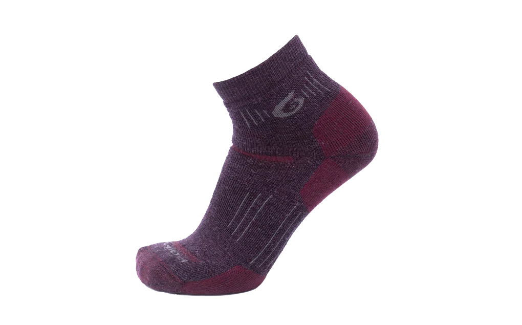 This medium cushioned quarter crew sock (2 1/2 inch cuff) helps combat lace pressure on the top of the foot by adding cushioning across the instep as well as under foot. The hiking tech medium mini merino wool sock works best with low-cut hiking shoes.