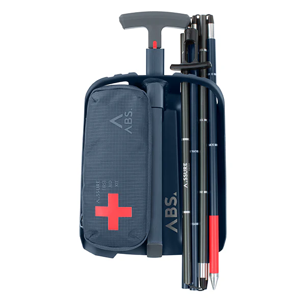 The ABS A.Ssure First Aid Kit is a lightweight and organized first aid kit developed as part of a complete mountain safety solution. It can be integrated into the safety compartment of a compatible ABS shovel or gear setup, ensuring emergency supplies are always easily accessible during backcountry adventures.