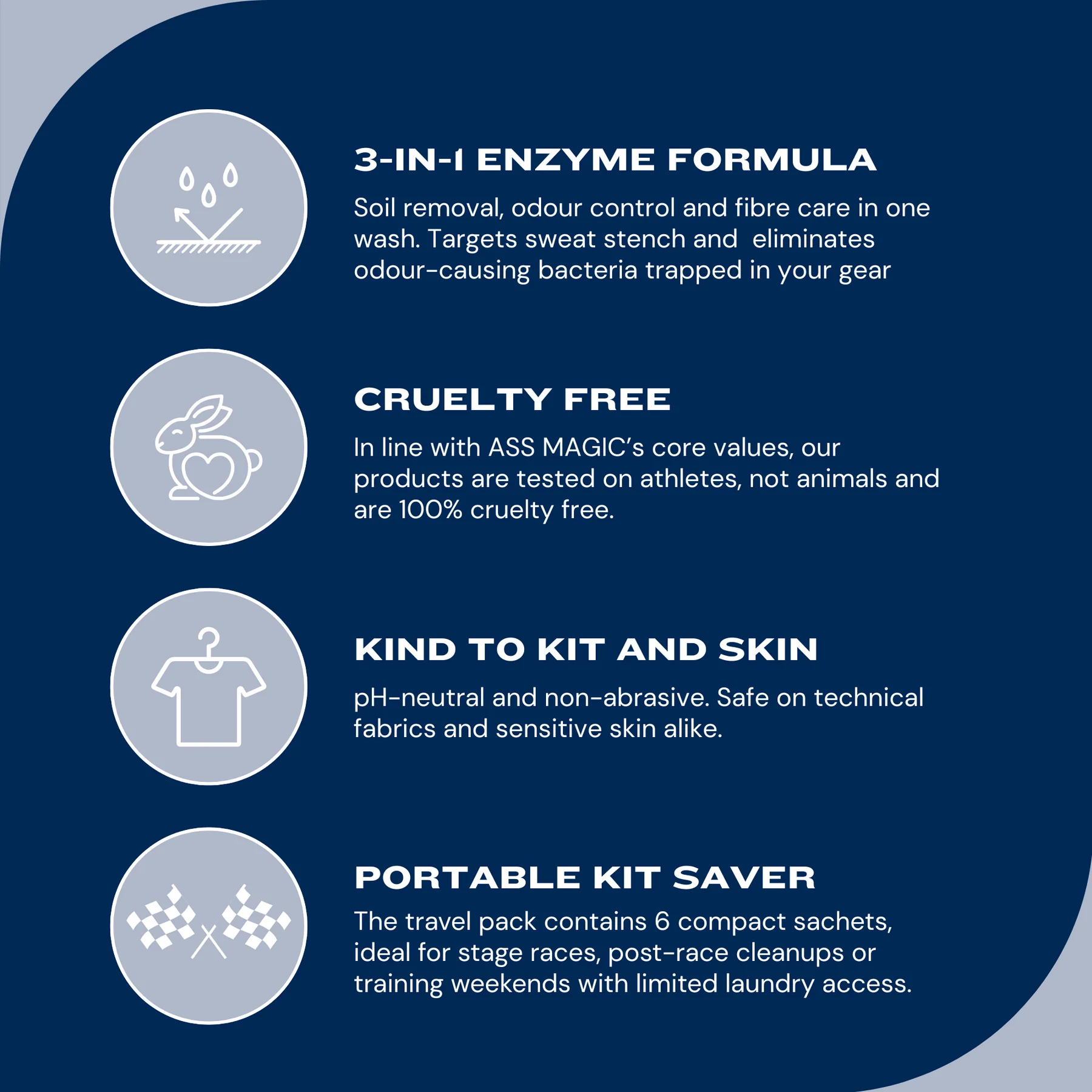 The ASS MAGIC Kit Wash Travel Pack is tailor-made for athletes on the move—cyclists, runners, triathletes—who push their limits in challenging environments. This pack contains 6 convenient 50 ml sachets, perfect for training camps, stage races, or multi-day adventures where laundry access is limited. The 3-in-1 formula removes stains, neutralizes odours, and cares for technical fabrics. It is pH-neutral, gentle on gear and skin, biodegradable, and free from phosphates and optical brighteners—offering powerful cleaning with eco-conscious integrity. No washing machine? No problem—just dissolve in water, soak, rinse, and hang to dry.
