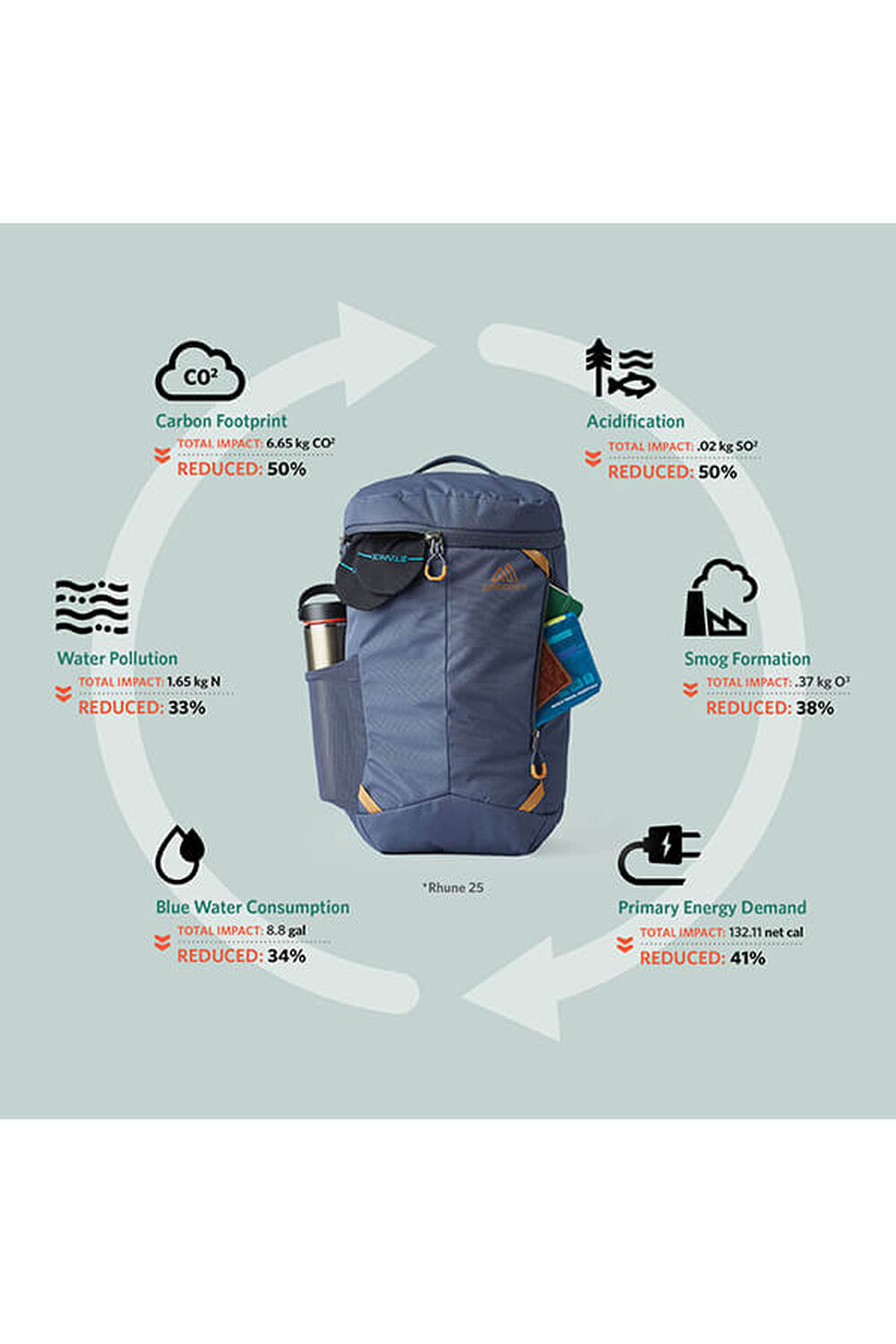 • All fabrics made from recycled content, resulting in 57% reduction in the carbon footprint compared to a conventional nylon pack