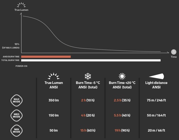 The Trail Runner runs on AAA batteries in a nimble battery pack which means that you never have to spend time on charging it. The battery pack is mounted comfortably on the headband on the back of your head.