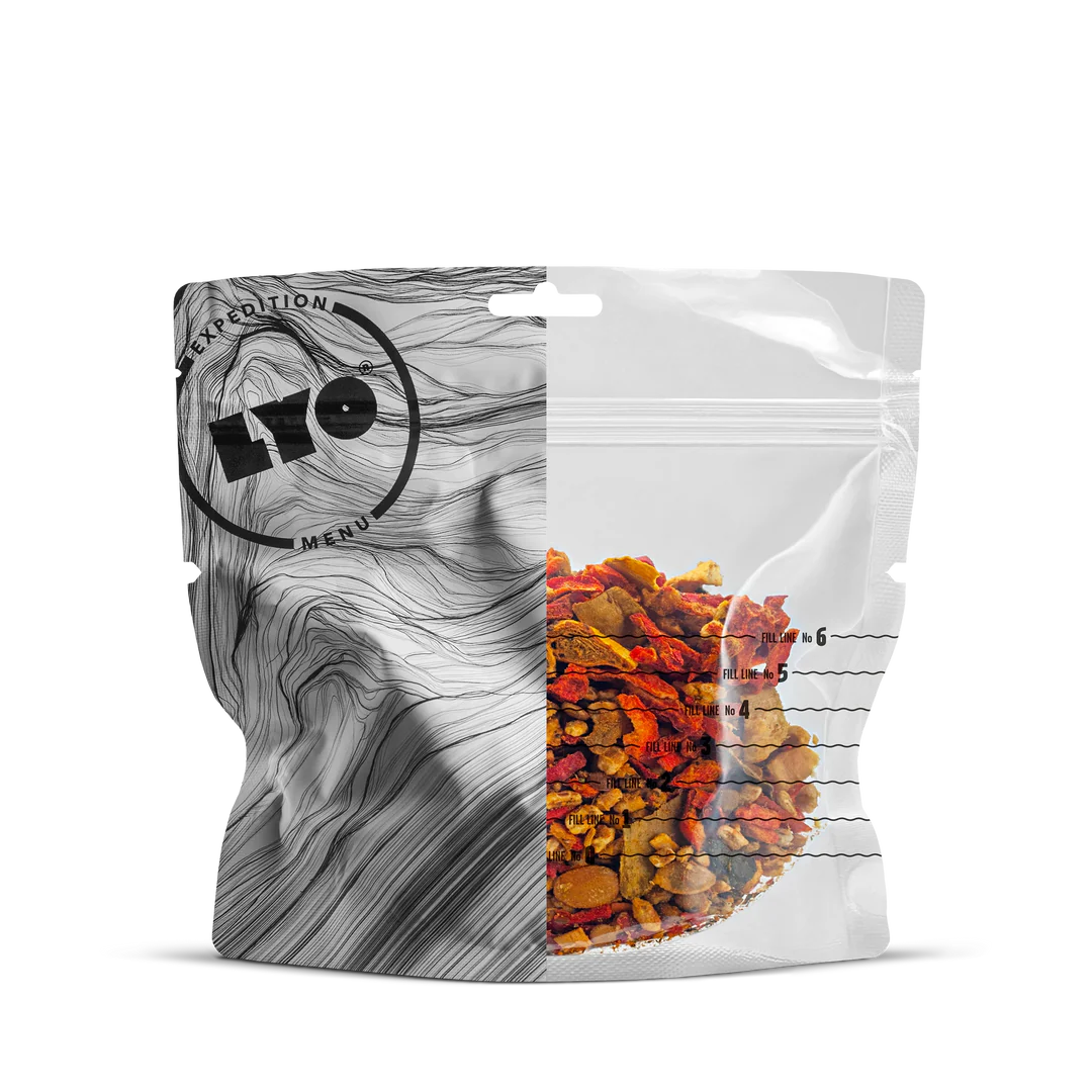 Long shelf life: LYO EXPEDITION meals can be stored for a long time. Since the water content is being removed during the freeze-drying process, microorganisms and enzymes action are inhibited. Each pouch is hermetically sealed and contains an oxygen absorber.