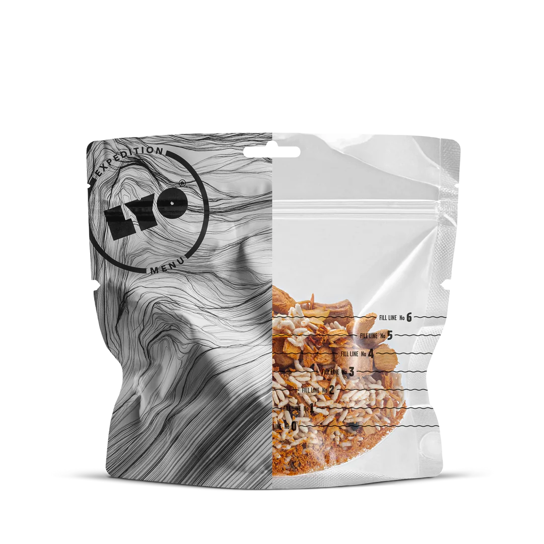 Długi okres trwałości: posiłki LYO EXPEDITION można przechowywać przez długi czas. Ponieważ zawartość wody jest usuwana podczas procesu liofilizacji, działanie mikroorganizmów i enzymów jest hamowane. Każda torebka jest hermetycznie zamknięta i zawiera pochłaniacz tlenu.
