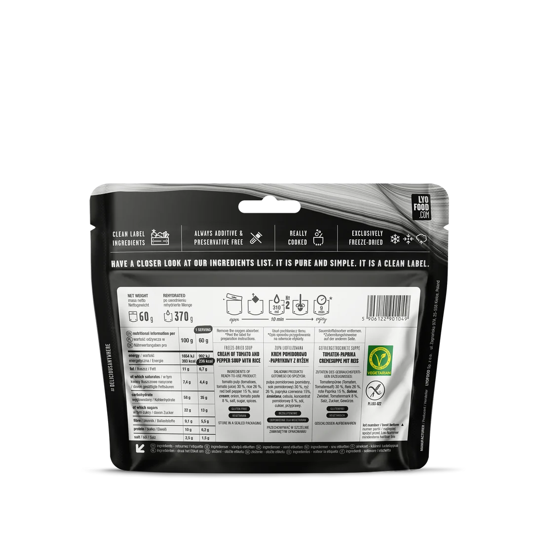 Wysoka wartość odżywcza: żywność liofilizowana ma bardzo wysoką liczbę kalorii. Ponadto zachowuje wszystkie naturalne witaminy i minerały żywności. Spożywanie posiłku LYO EXPEDITION pozwala na uzyskanie długotrwałej fizycznej wydajności szczytowej.