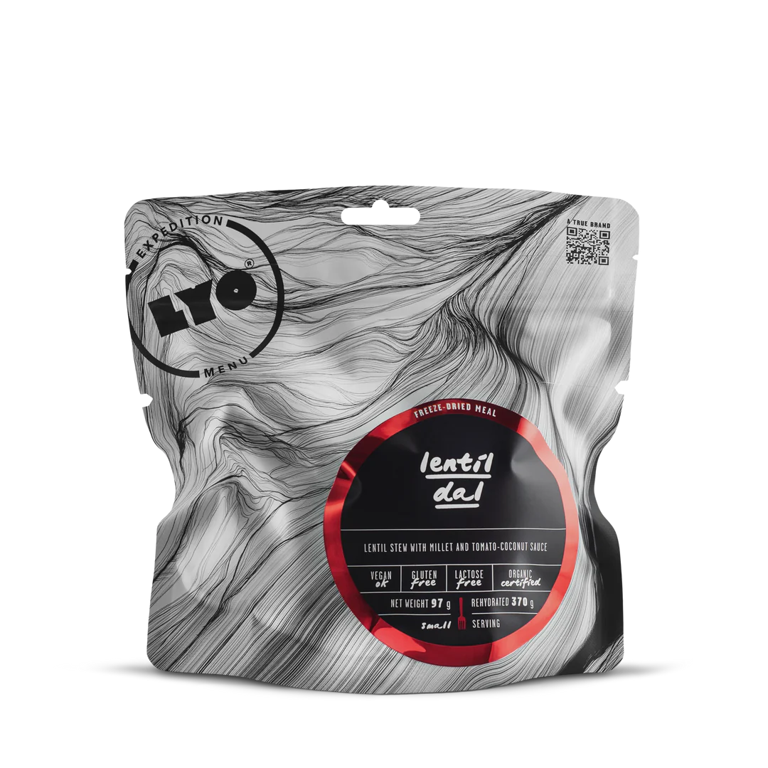 Dal is a famous traditional Indian stew that delights with its distinctive flavor and thick, creamy consistency. Loved by many for its infinite adaptability, dal comes in various versions depending on the individual preferences. At LYOFOOD we went for red lentils slow-simmered in a creamy coconut-tomato sauce and served with gluten-free millet. We topped it off with crispy green lentils to give it an extra crunchy texture. In short, the ultimate freeze-dried organic version of the Indian classic dish that will keep you warm for hours.