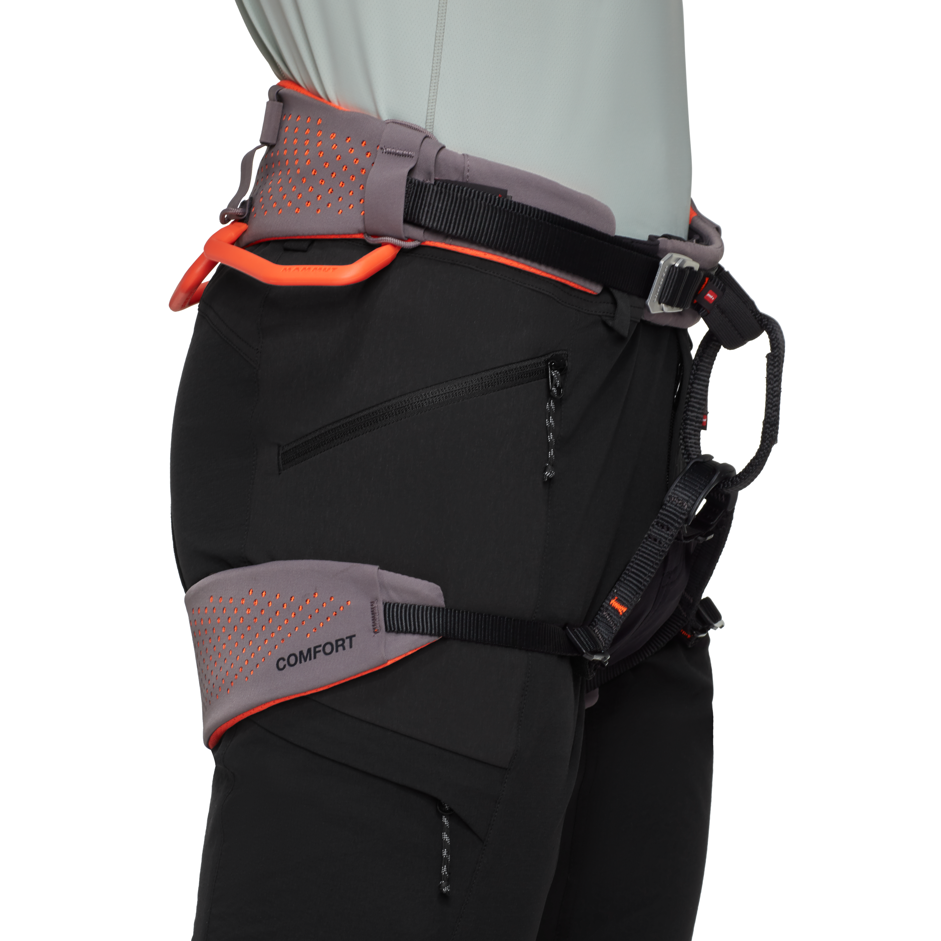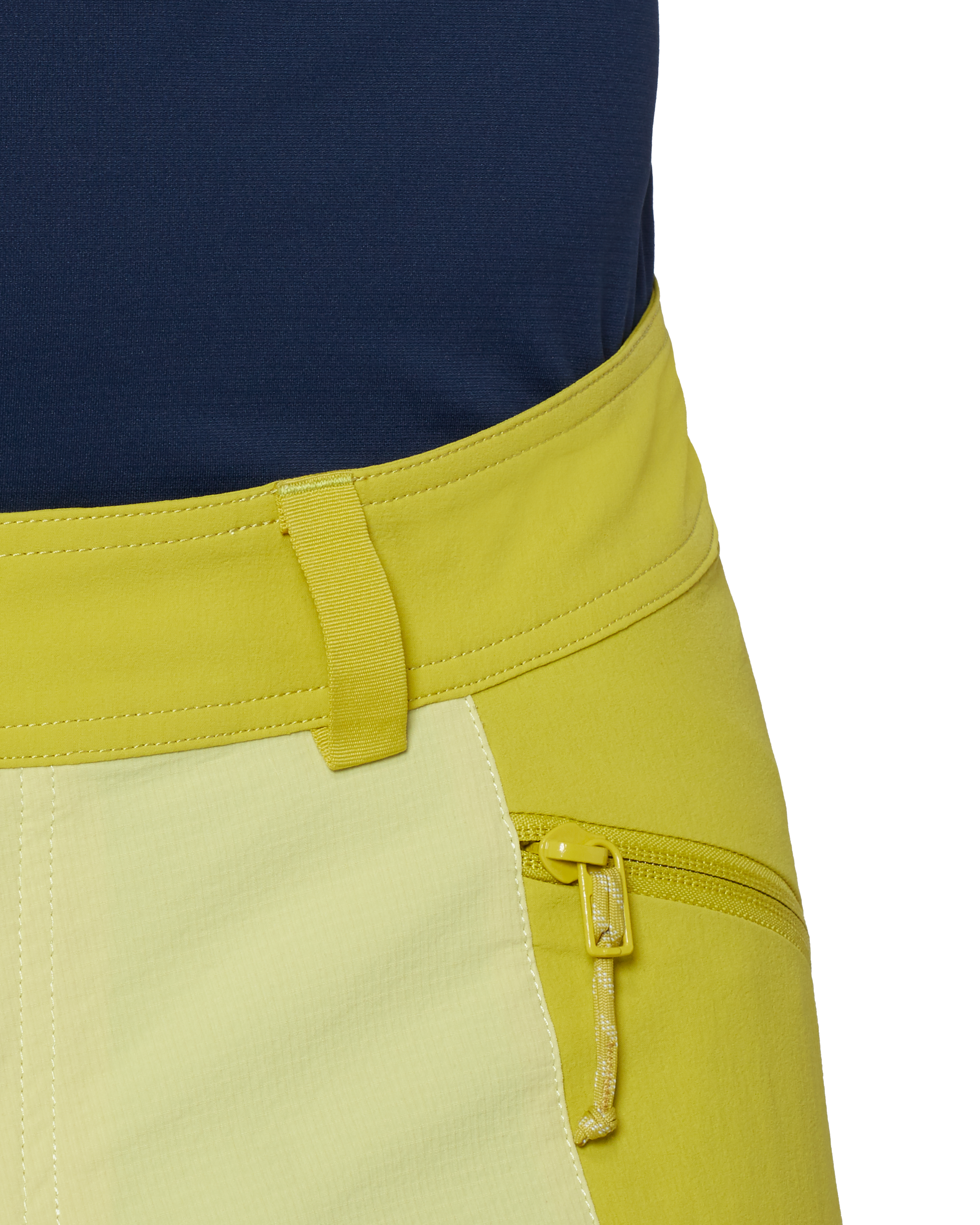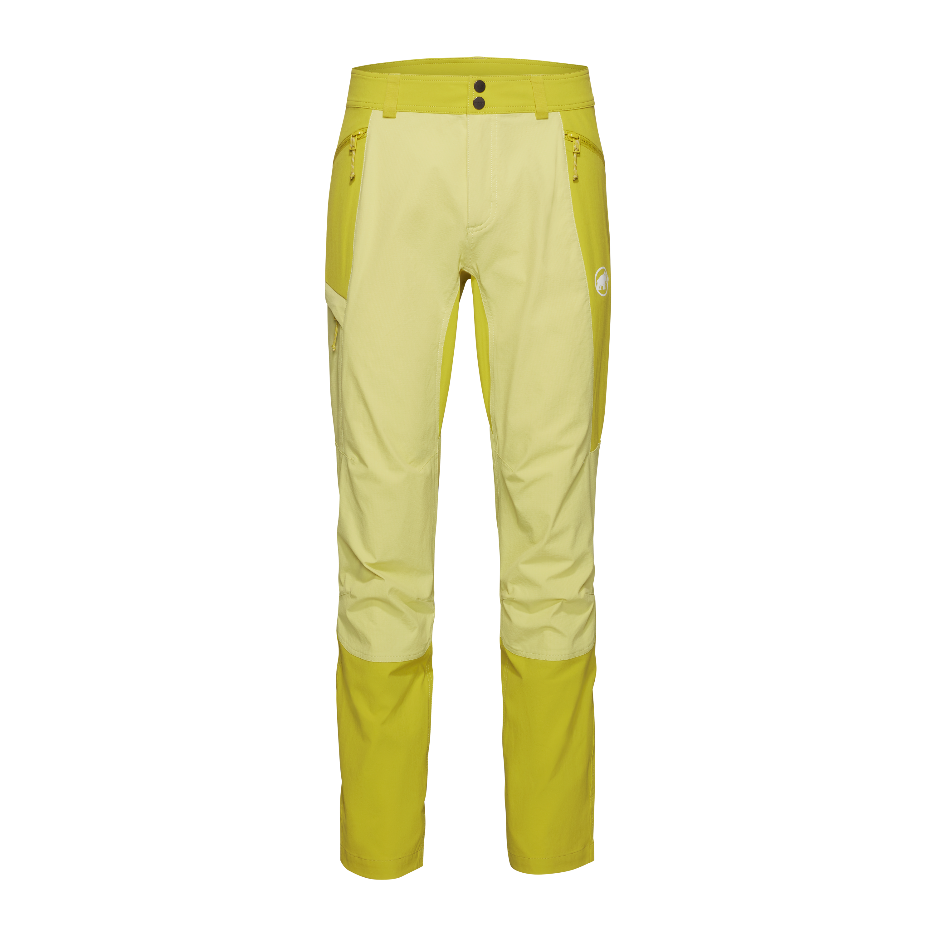The pants are built with a strong focus on practical details. They feature an elasticated rear waistband, belt loops, a concealed fly with snap buttons, a gusset crotch for greater freedom of movement, two zippered front pockets, and a harness-compatible zippered leg pocket. These elements make the model suitable not only for classic hikes, but also for more technical routes.