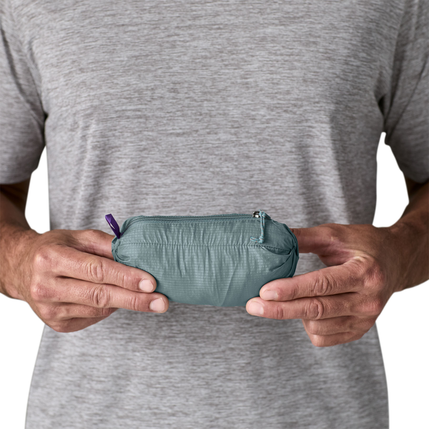Zippered chest pocket converts to stuffsack with a reinforced carabiner clip-in loop