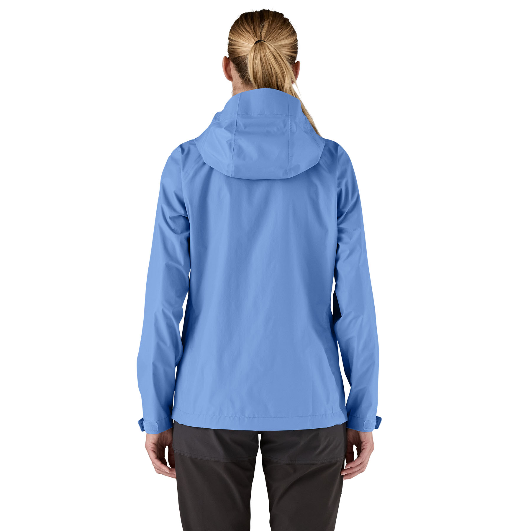 Self-fabric hook-and-loop cuff closures and an adjustable drawcord hem seal out precipitation