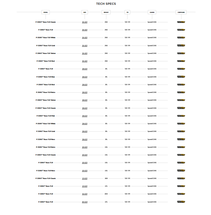 SPEEDCore | The highest performance tubeless option in the Pirelli range. The carcass is made of a thin, airtight rubber compound with aramid particles that covers the inside of the tire. The improved flexibility makes the tire faster and more supple, while the aramid provides better puncture resistance. The carcass is completed by a 120 TPI nylon fabric and an aramide puncture protection layer.