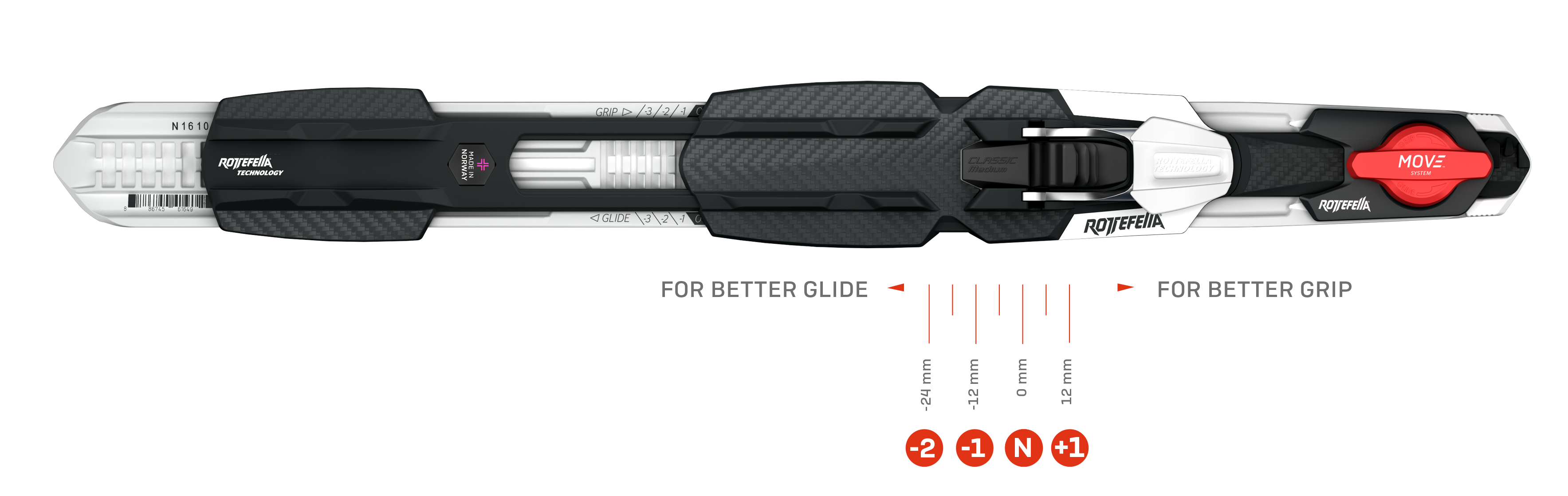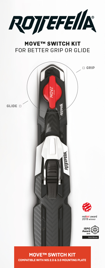 Upgrade to Rottefella Move system which provides you with maximum glide when seconds count. Simply lift, push and lock the lever and the binding is moved 30 mm backwards with one simple movement. Perfect for wax skis. Rottefella MOVE™ Race is approved by FIS and can be used in all competitions. Rottefella MOVE Race Kit for NIS 3.0 fits all skis with NIS 3.0 mounting plate.