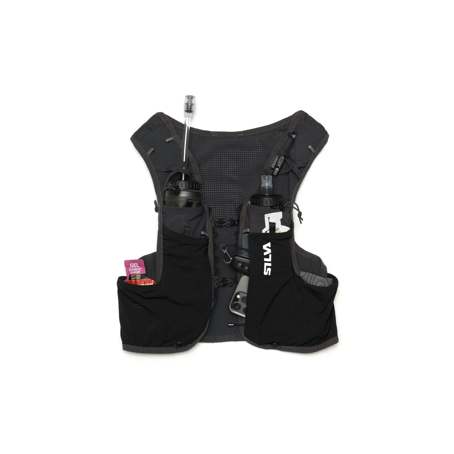 Strive Fly lets you bring everything you need during fast runs and races. On the front, the vest has two pockets for bottles with adjustable straps to keep bottles and straws in place. The side pockets have dual openings (front and side) for easy access to gels, bars, or gloves. The easily accessible mesh pocket at the back is spacious, and the zip pocket with a key hook is perfect for storing your phone. The vest also features attachments for running poles and Strive Quiver, reflective details, and an emergency whistle.