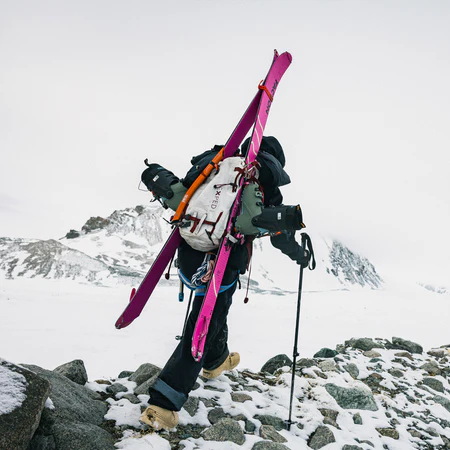 The lightweight Karuba wood core combined with a full carbon weave provides strength and stability without unnecessary weight, making ascents easier and descents more responsive and fun. The tip and tail rocker enhances float and turn initiation, while the flat tail and medium flex deliver reliable edge hold and control in mixed snow conditions.